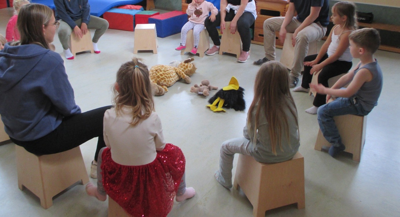 Auch einige Eltern beteiligten sich an den Musikwochen und teilten mit den Kindern ihre Freude an der Musik. So wurden mitunter von einem Papa die eigenen Instrumente (Gitarre, Keyboard & Cajon) in einem Morgenkreis vorgestellt und gemeinsam mit den Kindern musiziert. Auch hierfür ein großer Dank!