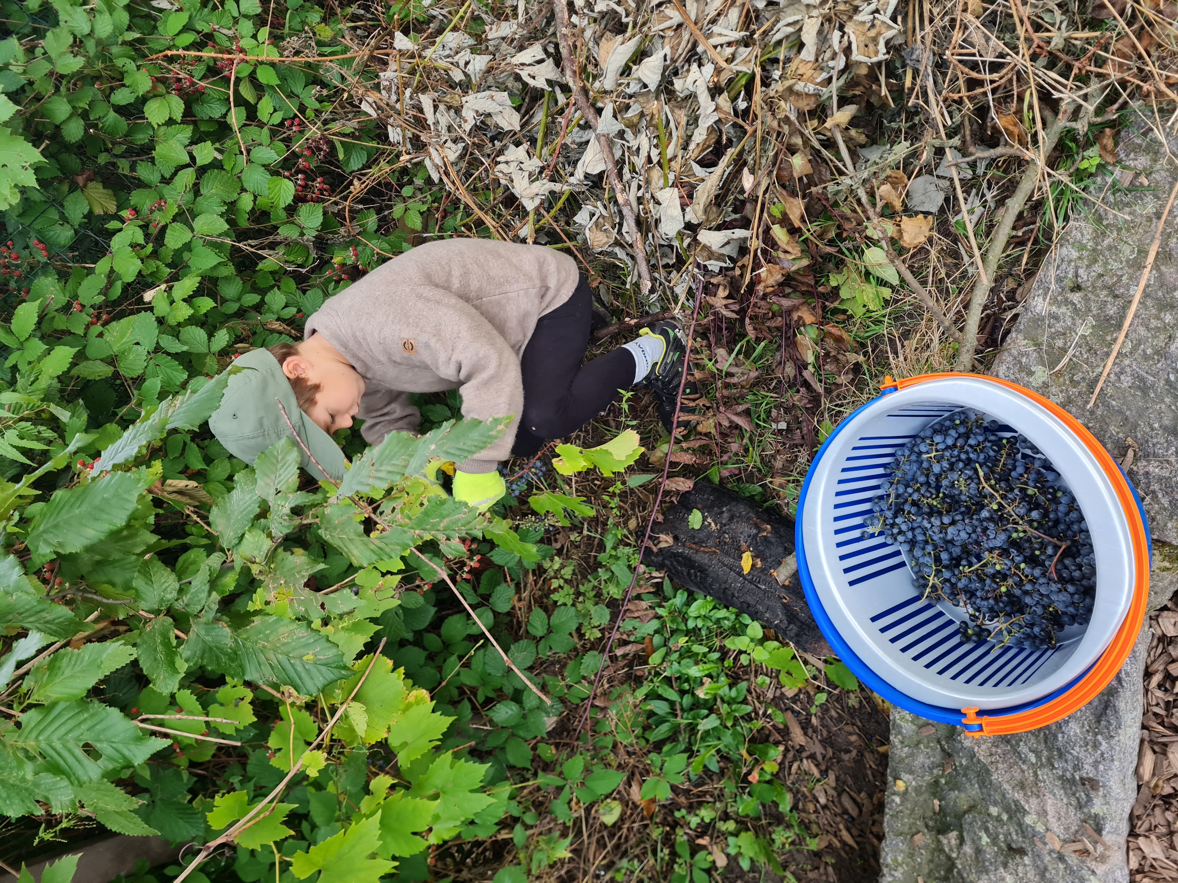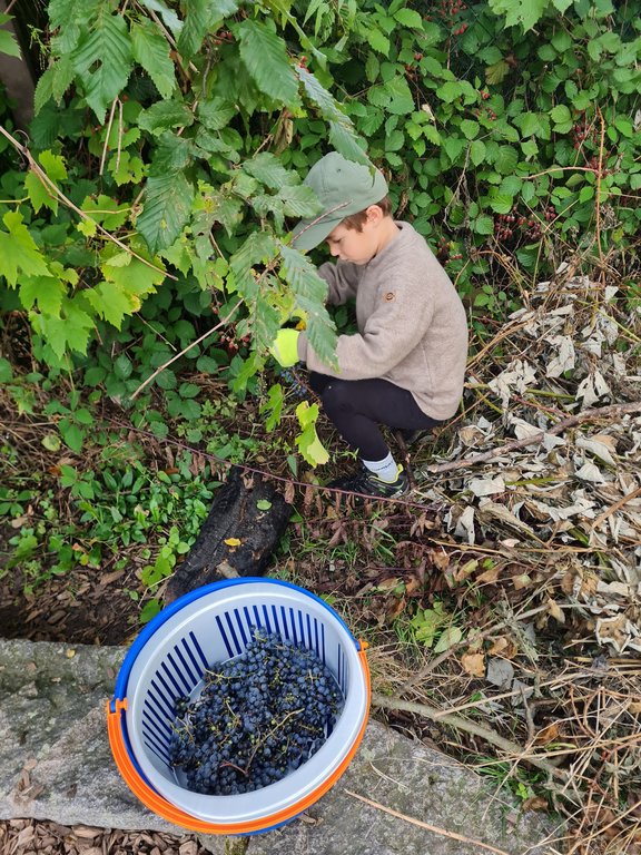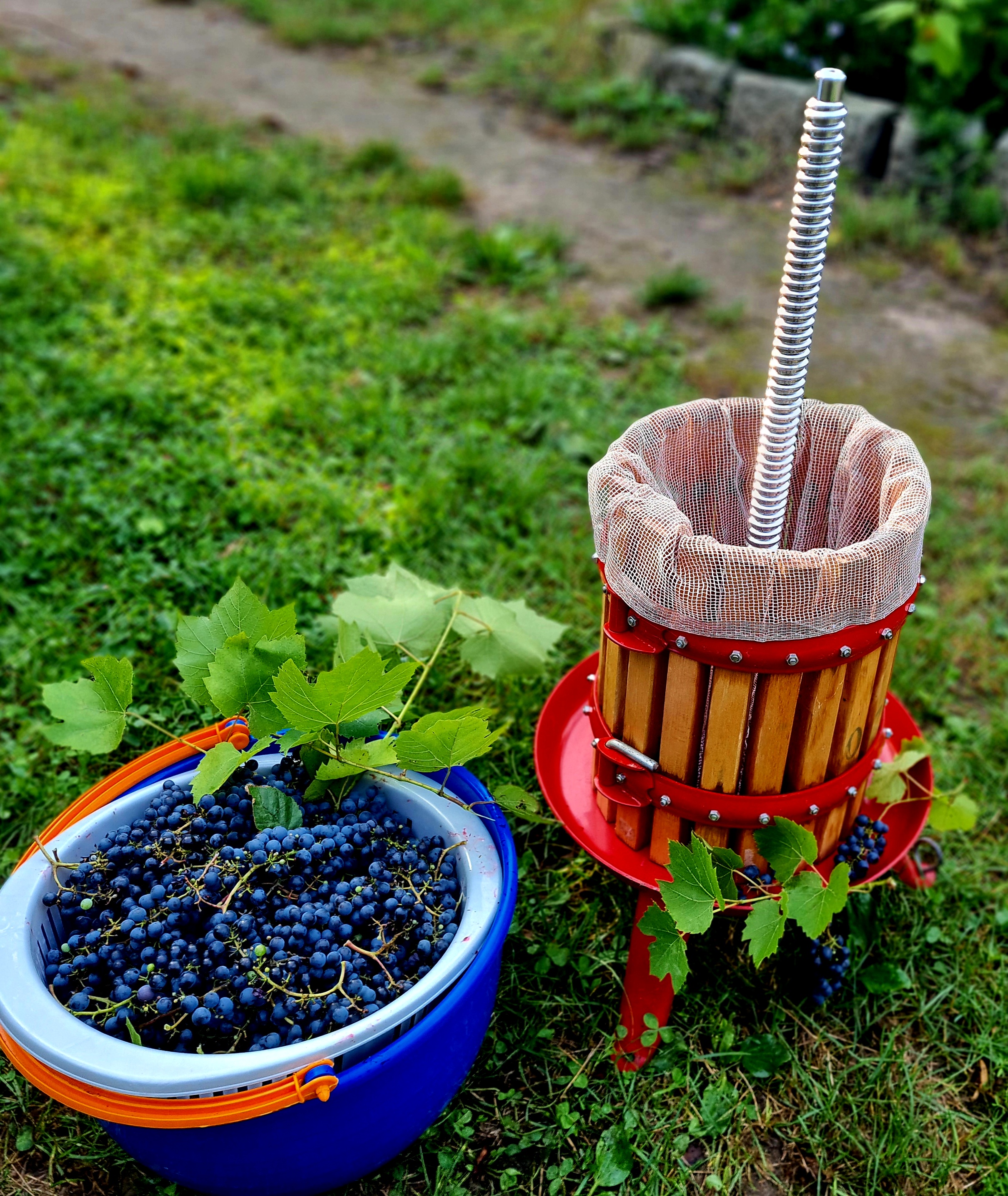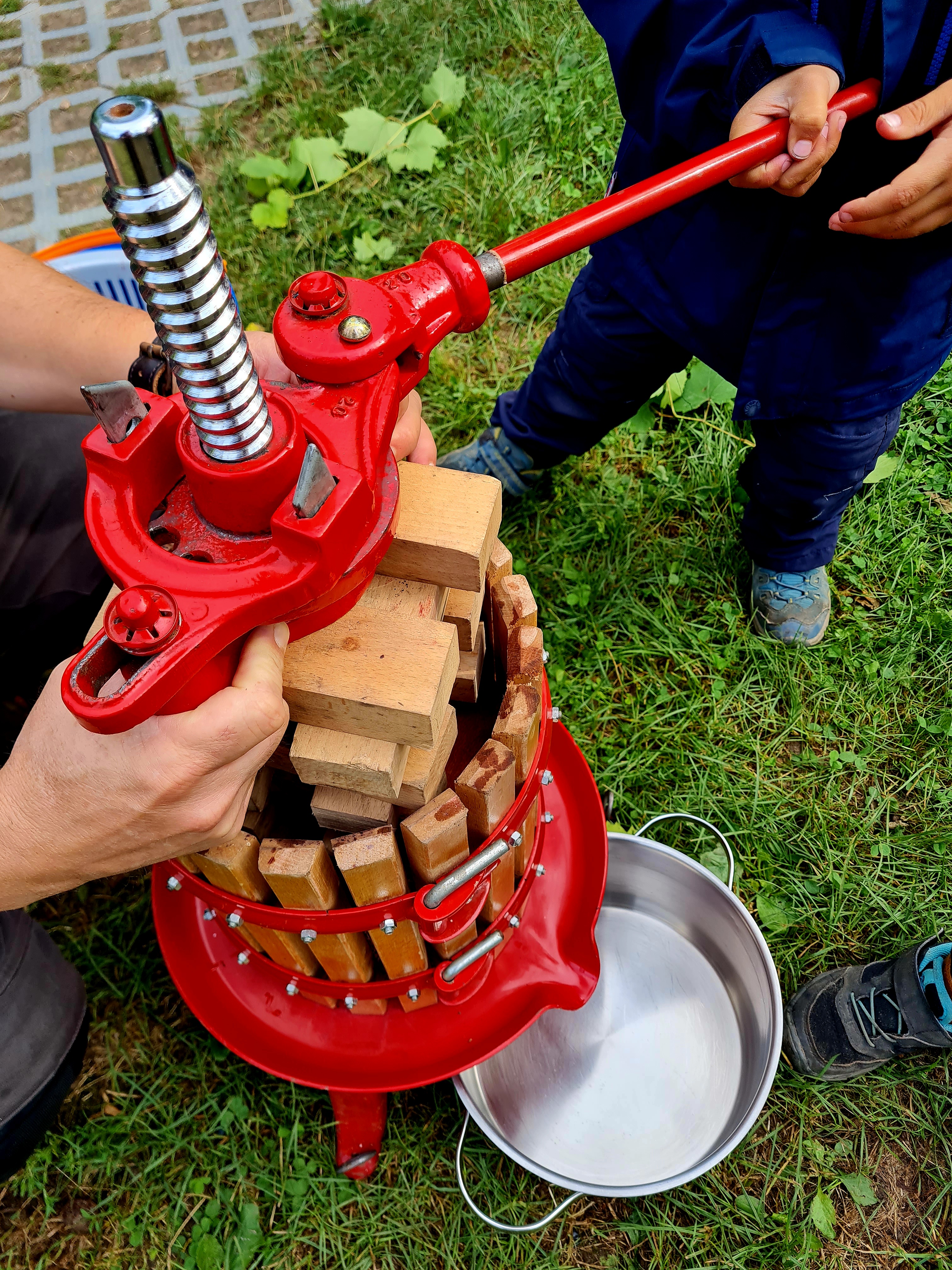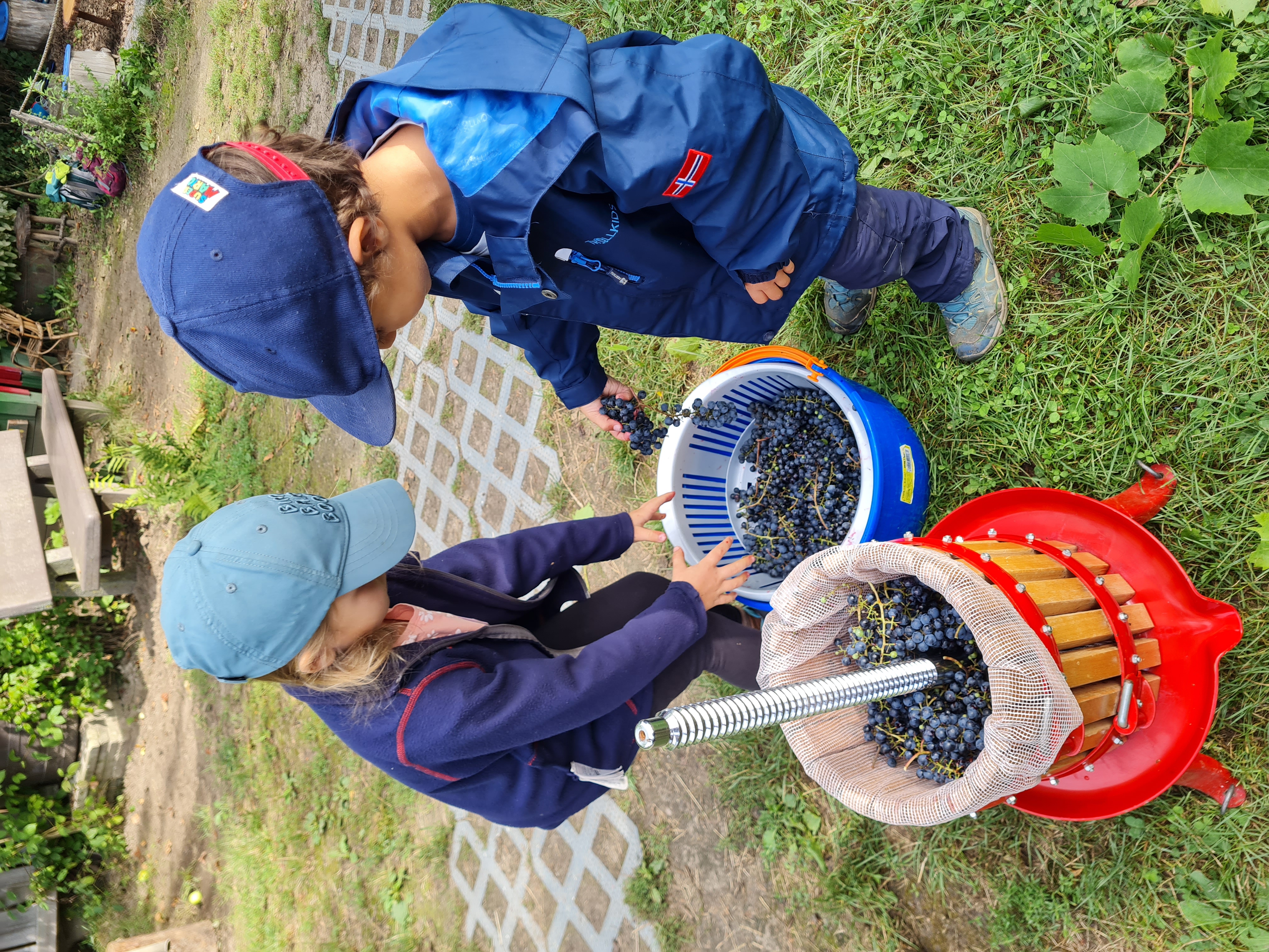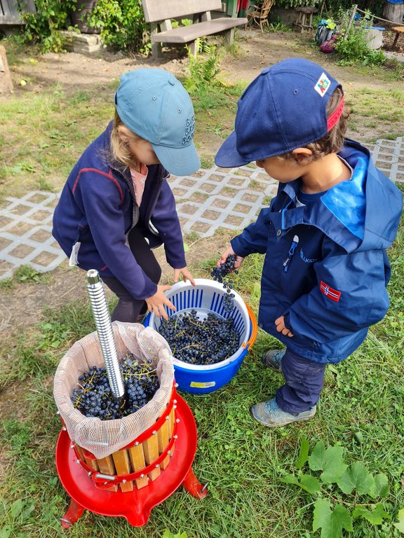 Wir haben auf dem Grundstück des Waldkindergartens Weintraubenreben und haben so schon öfters Weintraubensaft hergestellt. Dieses Jahr hat es wieder geklappt, bevor Vögelchen oder auch unsere Kinder die Trauben gepflückt und verputzt haben. Alle, die Lust hatten, konnten die Beeren mit Kraft und Ausdauer mit pressen. Im Abschlusskreis haben wir den Weintraubensaft dann miteinander geteilt. Leider hat sich die Reblaus bei uns breit gemacht und wir wissen nicht, ob wir nächstes Jahr noch ausreichend Weintrauben haben werden.