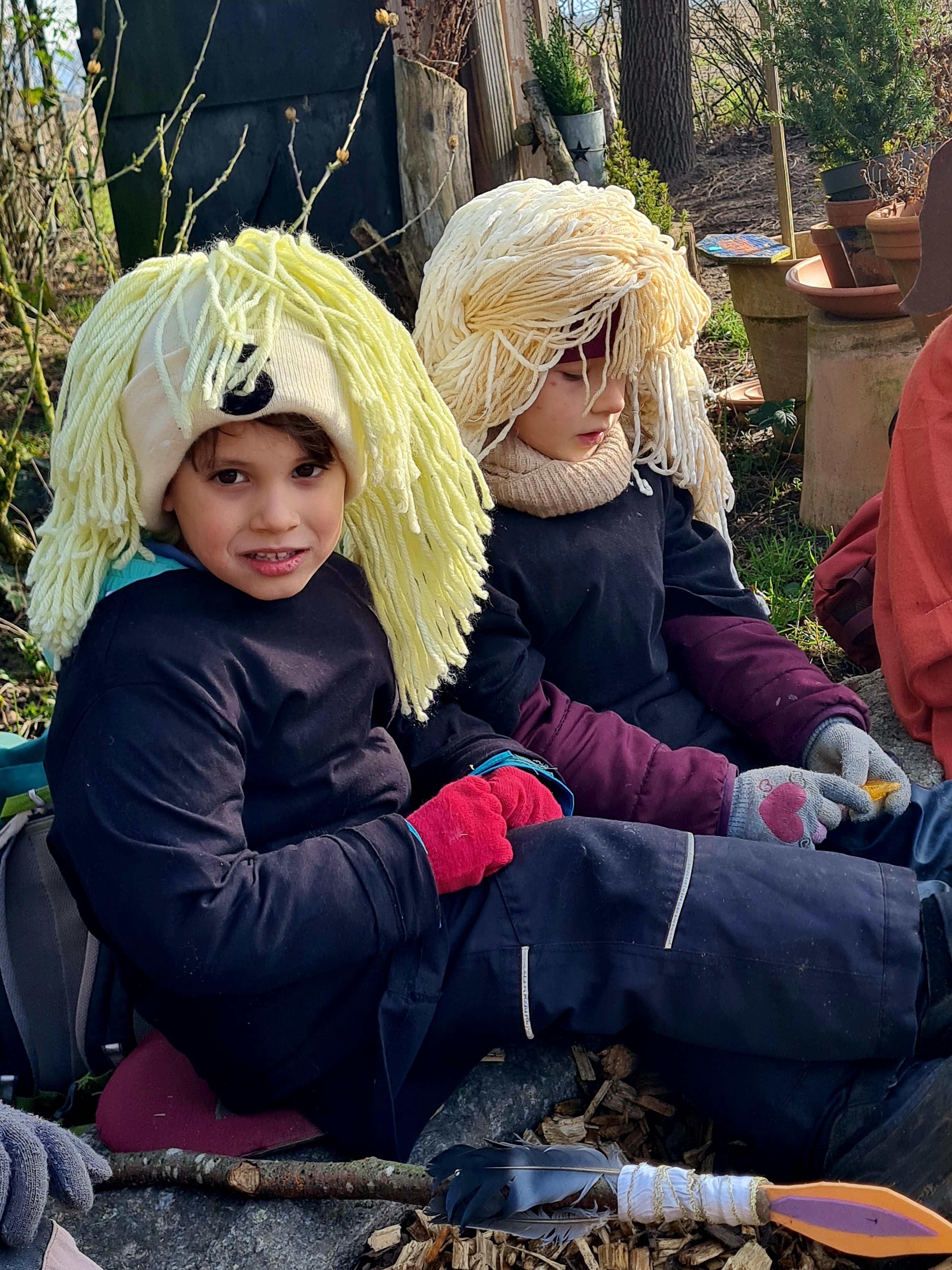 Vor einiger Zeit haben die Kinder und das Erzieherteam mit Begeisterung drei spannende Bücher von Die kleinen Wilden gelesen. Im Anschluss kam die Idee auf, an einem der drei Faschingstage eine der Geschichten mit den Kindern nachzuspielen. Im Vorfeld wurden Sperre gebastelt. Wer wollte, kam am Faschingsdienstag als kleiner Wilder oder als Mammut verkleidet. Die Geschichte Die Mittagsschläfchenfalle wurde augesucht, in der die kleinen Wilden mal wieder einen Plan ausheckten. Sie bauten ein Bett für das Mammut aus Moos, damit er dort sein Mittagsschläfchen halten kann. Dann könnten die kleinen Wilden, versteckt, das Tier fangen. Doch der Plan ging nicht auf, denn die kleinen Wilden waren so laut, so dass das Mammut aufwachte. Das Mammut verjagte wütend die kleinen Wilden. Zu Hause angekommen, ohne Beeren, die die kleinen Wilden eigentlich pflücken sollten, bekamen sie dann noch von ihren Eltern eine Strafe für das Zuspätkommen. Sie mußten wieder vor der Höhle über Nacht schlafen.