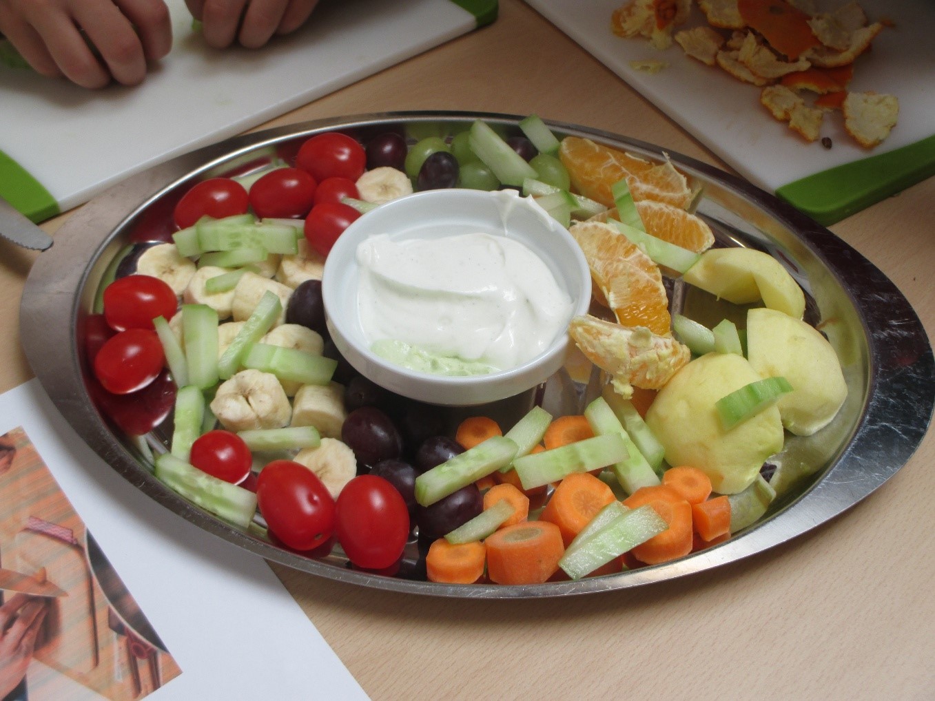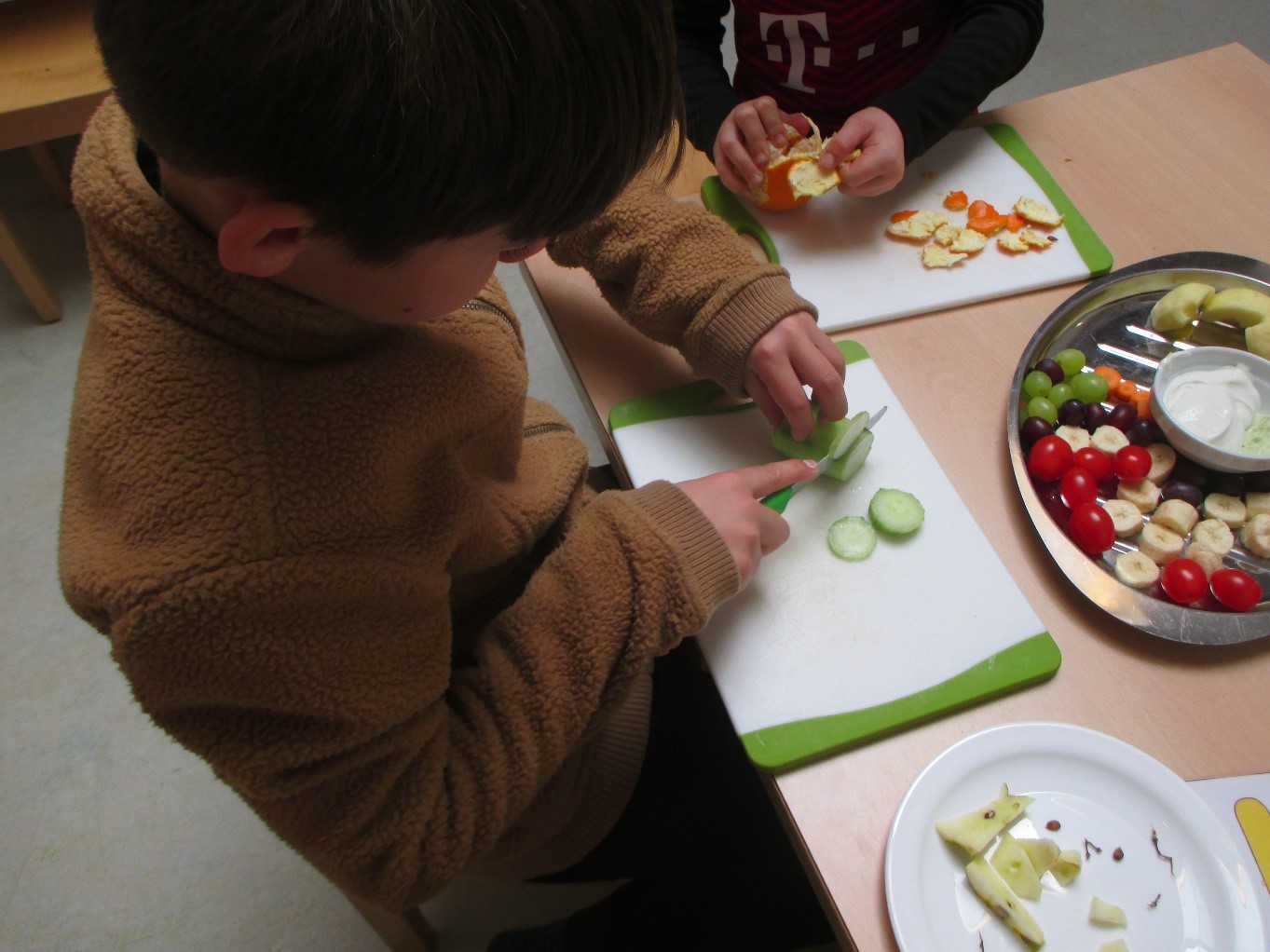 Am Nachmittag bestand für die Kinder zudem die Möglichkeit, für ihre Gruppen ihre Snackplatten für den Nachmittag selbst vorzubereiten und zu gestalten. Dabei stand ihnen eine reichliche Auswahl an gesundem Obst und Gemüse sowie an leckeren, erfrischenden Dips zur Verfügung.