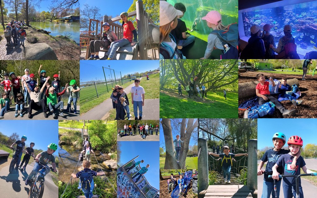 Am Dienstag, den 07.04.26 startete dann auch schon wieder das Ferienprogramm. Frisch und ausgeruht trafen sich die Schulkinder und ErzieherInnen wieder in der Einrichtung um gemeinsam mit dem Fahrrad zum Familiensportpark West aufzubrechen. Dort angekommen hatten die Kinder die Möglichkeit mit den, von Bernd Ackermann und Joachim Keune, verliehenen Rollern die Pumptrack zu befahren, auf der Wiese Fußball zu spielen und die zahlreichen Bewegungsangebote des Sportparks zu nutzen. Bei schönstem Wetter machte sich die Gruppe am Mittwoch auf dem Weg zum Luisenpark in Mannheim. Neben den vielen Spielplätzen, hatten im Besonderen das Reptilienhaus und die Unterwasserwelt die Kinder in ihren Bann gezogen. Der Besuch des Viernheimer Hallenbads am Donnerstag, bereitete den Kindern so viel Spaß, dass man sich gemeinsam dazu entschloss am nächsten Tag gleich noch einmal hinzugehen. Das Ende der Ferienzeit wurde dann noch mit einem gemeinsamen Eis versüßt.
