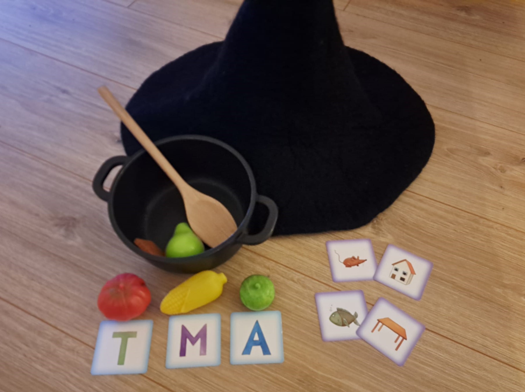 Zu Objekten auf Bildkarten suchten die Kinder passende Reimwörter. So wurden beispielsweise der Fisch in einen Tisch oder das Haus in eine Maus verwandelt. Darüber hinaus wurden verschiedene Buchstaben erkannt und passende Zutaten gesucht, die mit dem jeweiligen Laut beginnen, um damit schließlich eine bunte „Hexensuppe“ zu kochen.