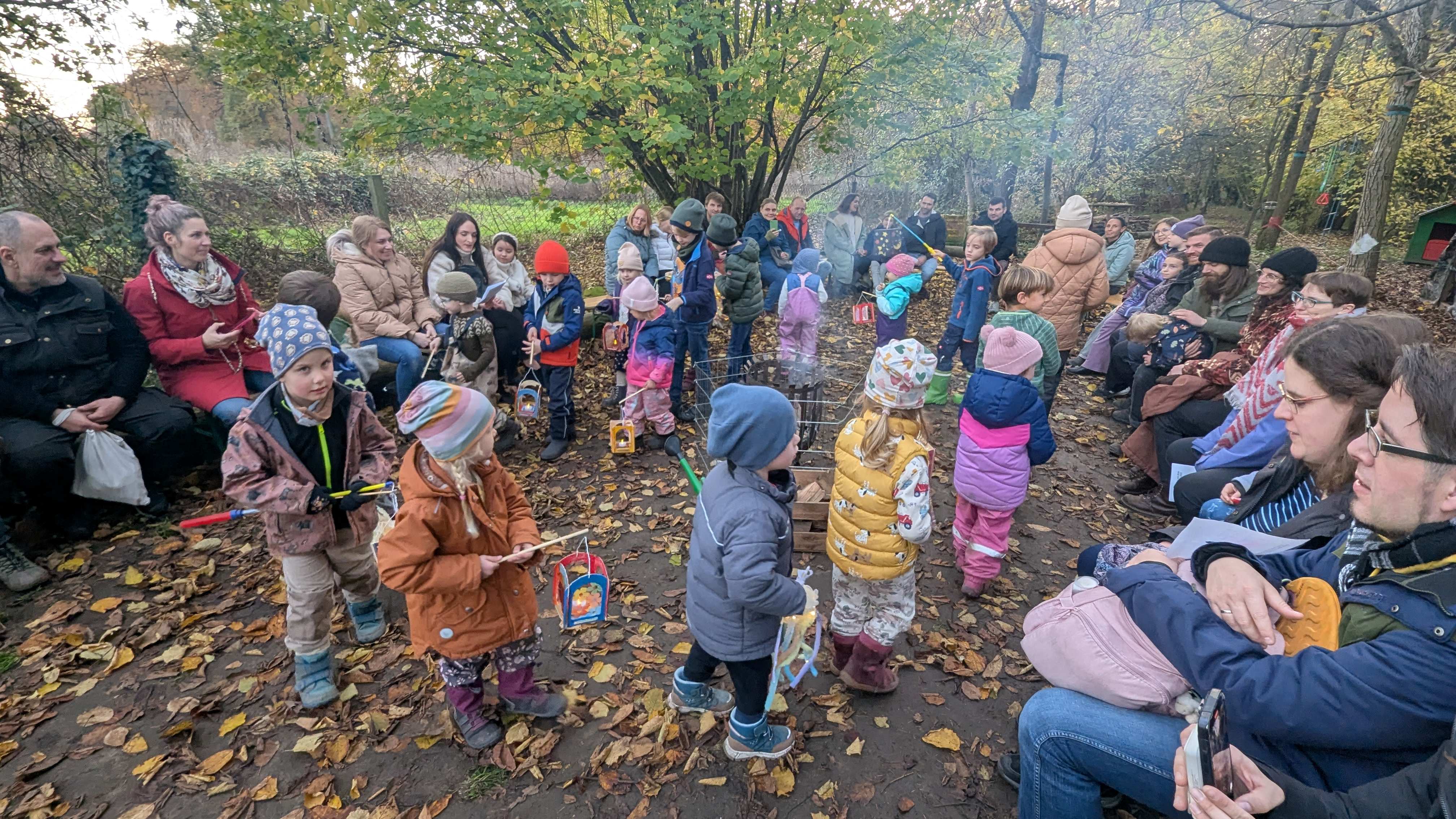 Am 11.11. trafen sich die Familien um 16 Uhr auf dem Grundstück des Waldkindergartens. Beleuchtet von Fackeln und Laternen