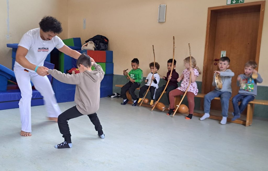 Das Kinderdörfel freut sich über eine neue, lebendige Kooperation: Ab sofort bietet Diogo Marinho de Oliveira Capoeira für Kinder an. Schon in der Schnupperstunde machte er den Kindern mit vollem Elan Capoeira vertraut – mit Erfolg! Die Kinder hatten von Anfang an sichtlich Spaß und waren mit Begeisterung dabei.