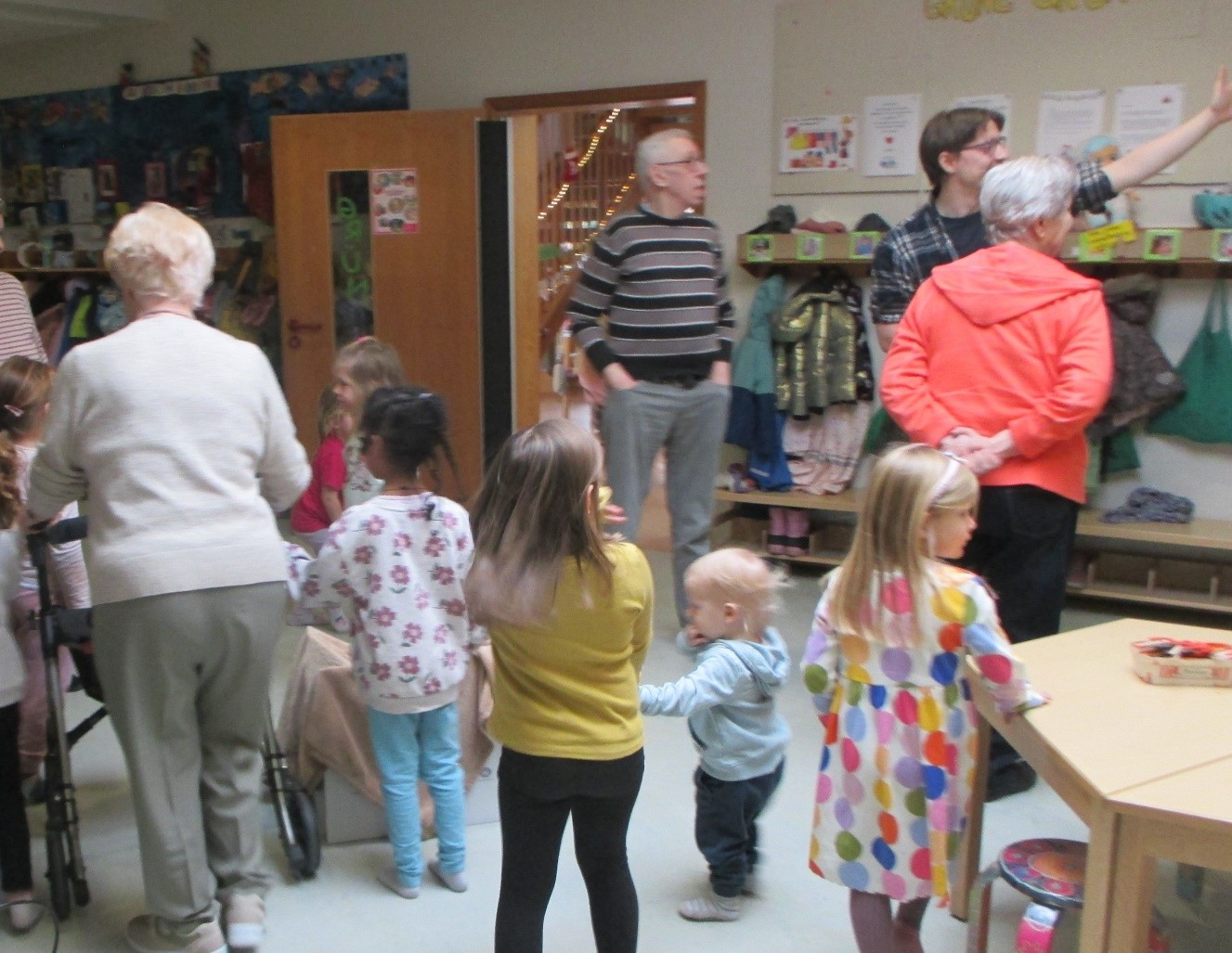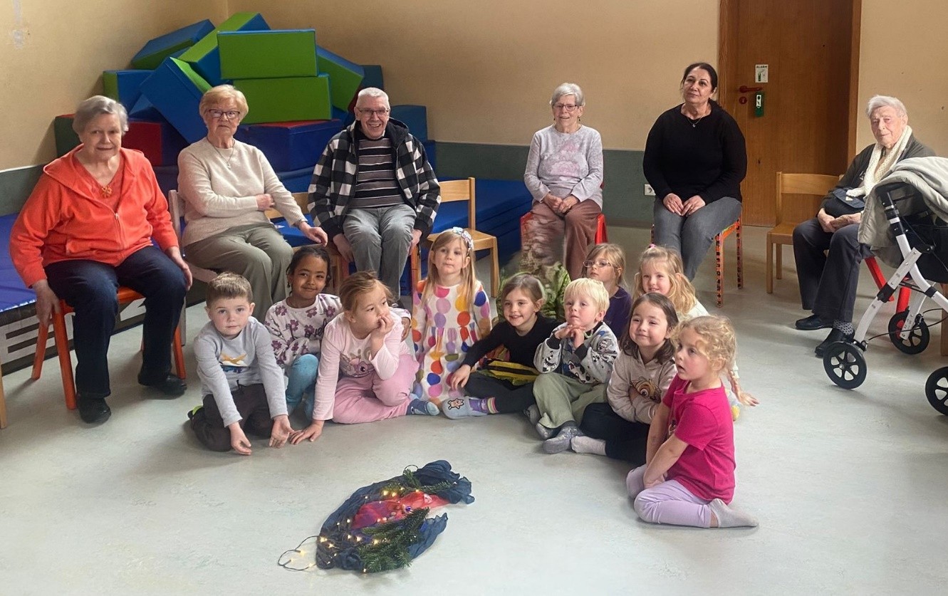 Ein besonderes Highlight war die anschließende Führung durch die Räume des Dörfels: Die Kinder begleiteten die älteren Besucherinnen und Besucher durch die Räume, boten helfend ihre Hände oder den Arm am Rollator an. Unsere Gäste zeigten sich begeistert und erzählten unterwegs von ihren Kindergarten-Erinnerungen.