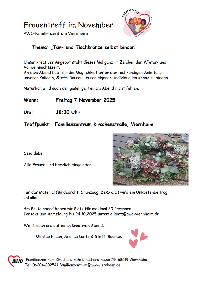 Am Bastelabend haben wir Platz für maximal 20 Personen. Kontakt und Anmeldung bis 24.10.2025 unter: a.lantz(at)awo-viernheim.de